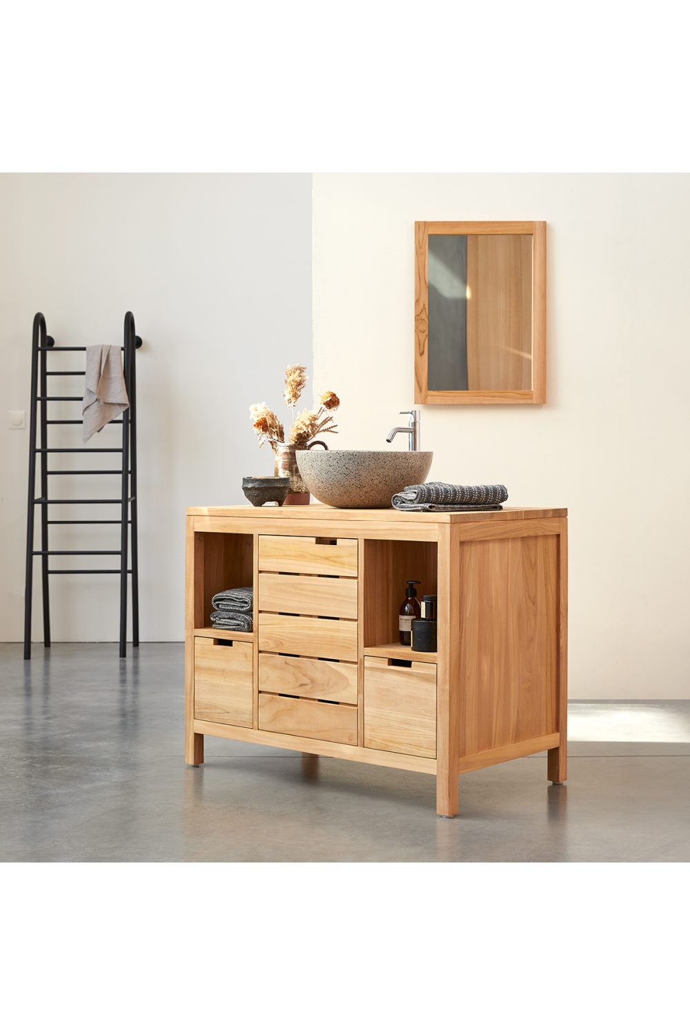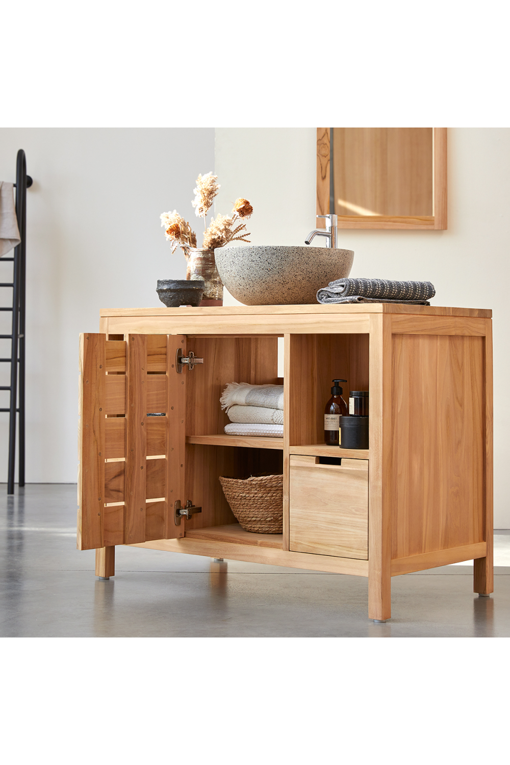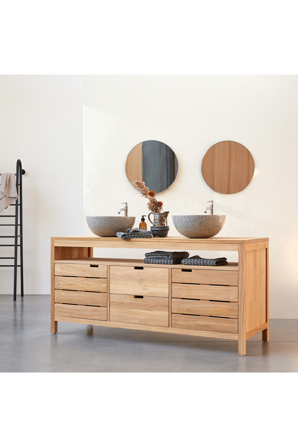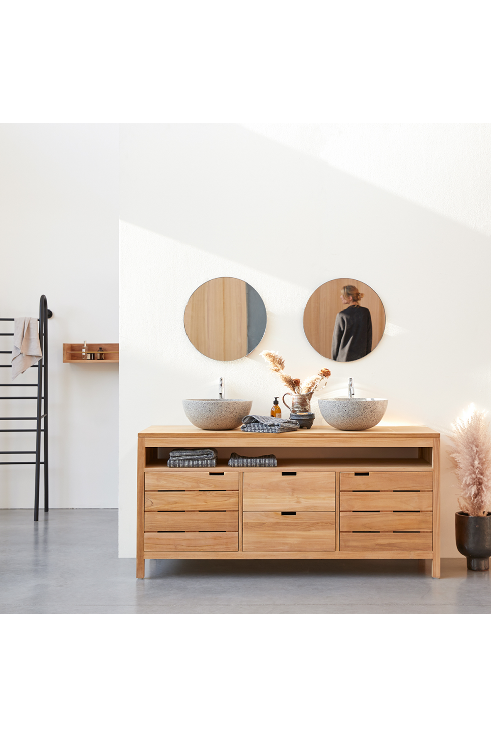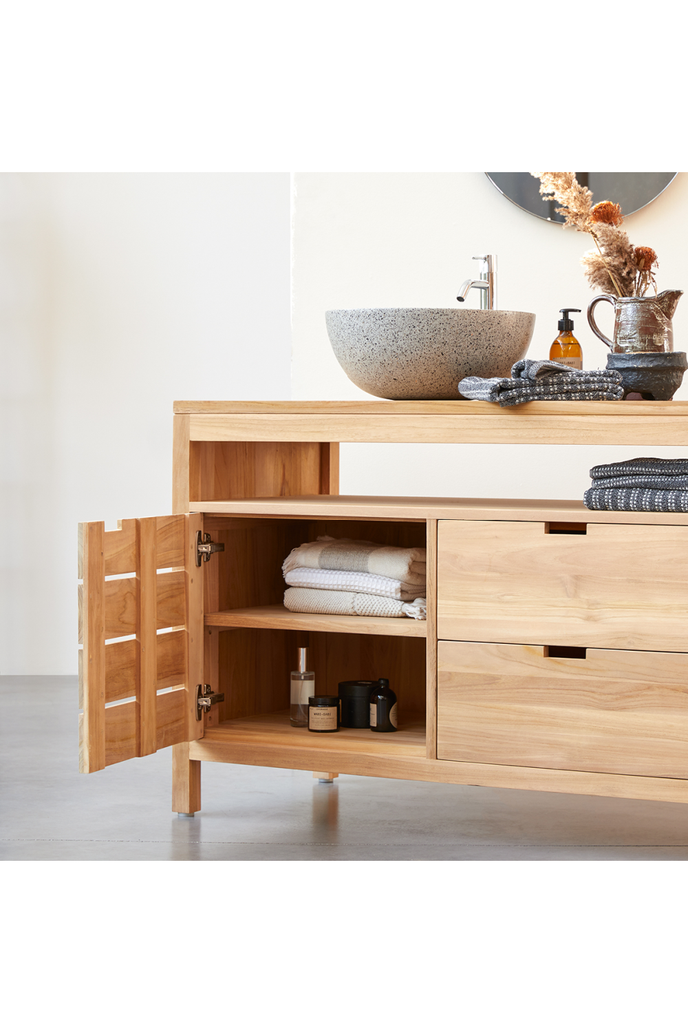 Beautiful bathroom furniture in solid teak. Designed to accommodate 1 sink. The beautifully grained natural teak wood brings light and color into your bathroom. The modern design and large storage capacity make this a convenient and stylish space saver. Discover our range of marble and terrazzo countertops.
