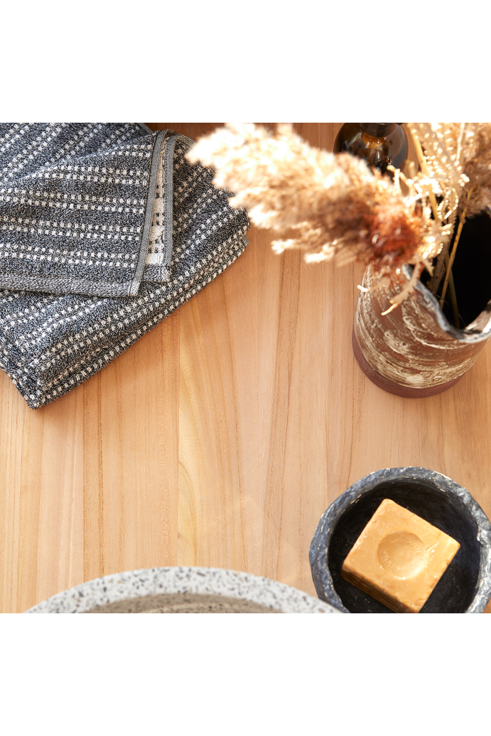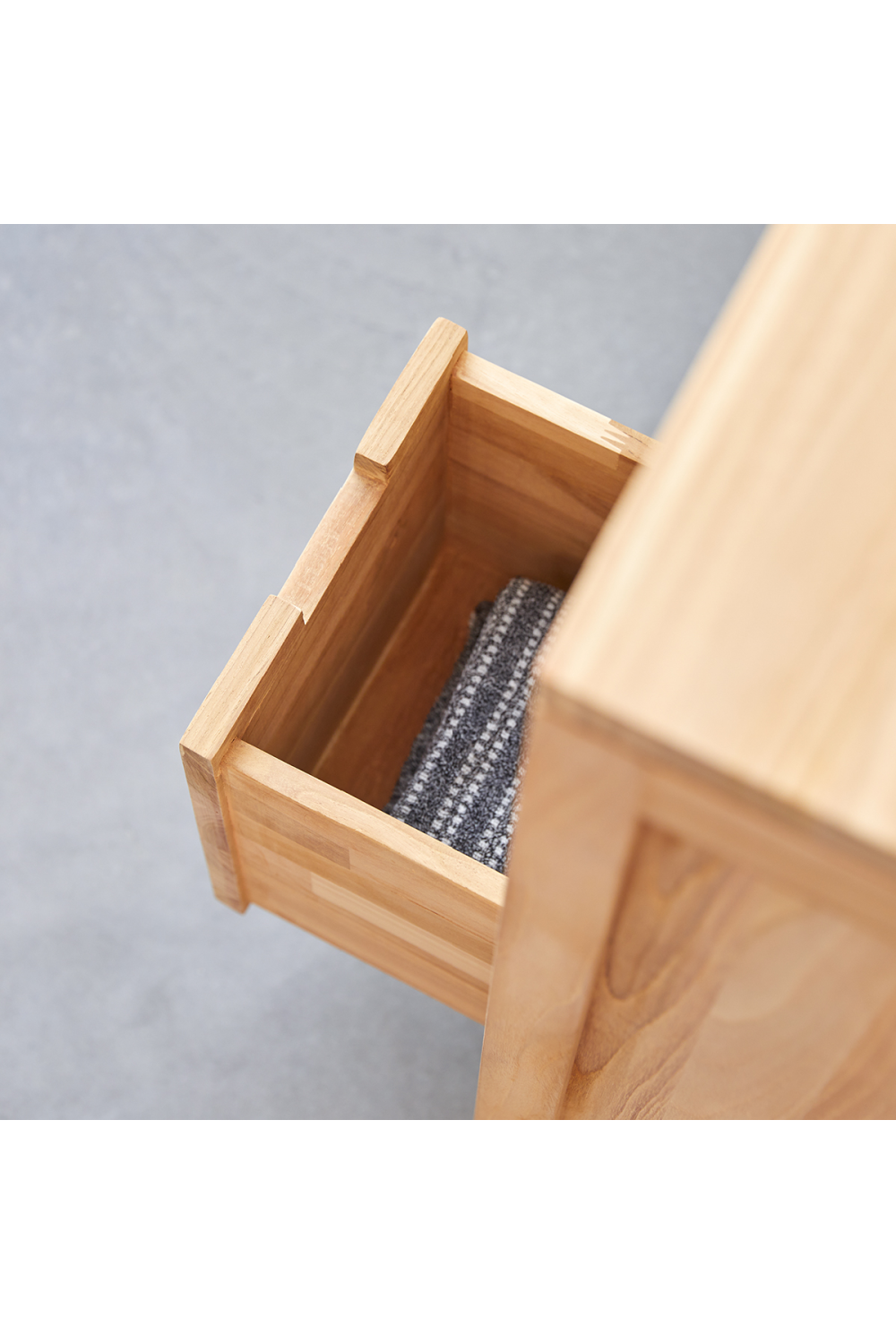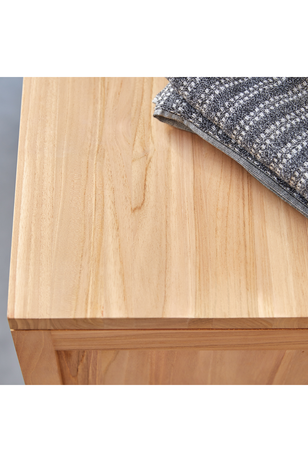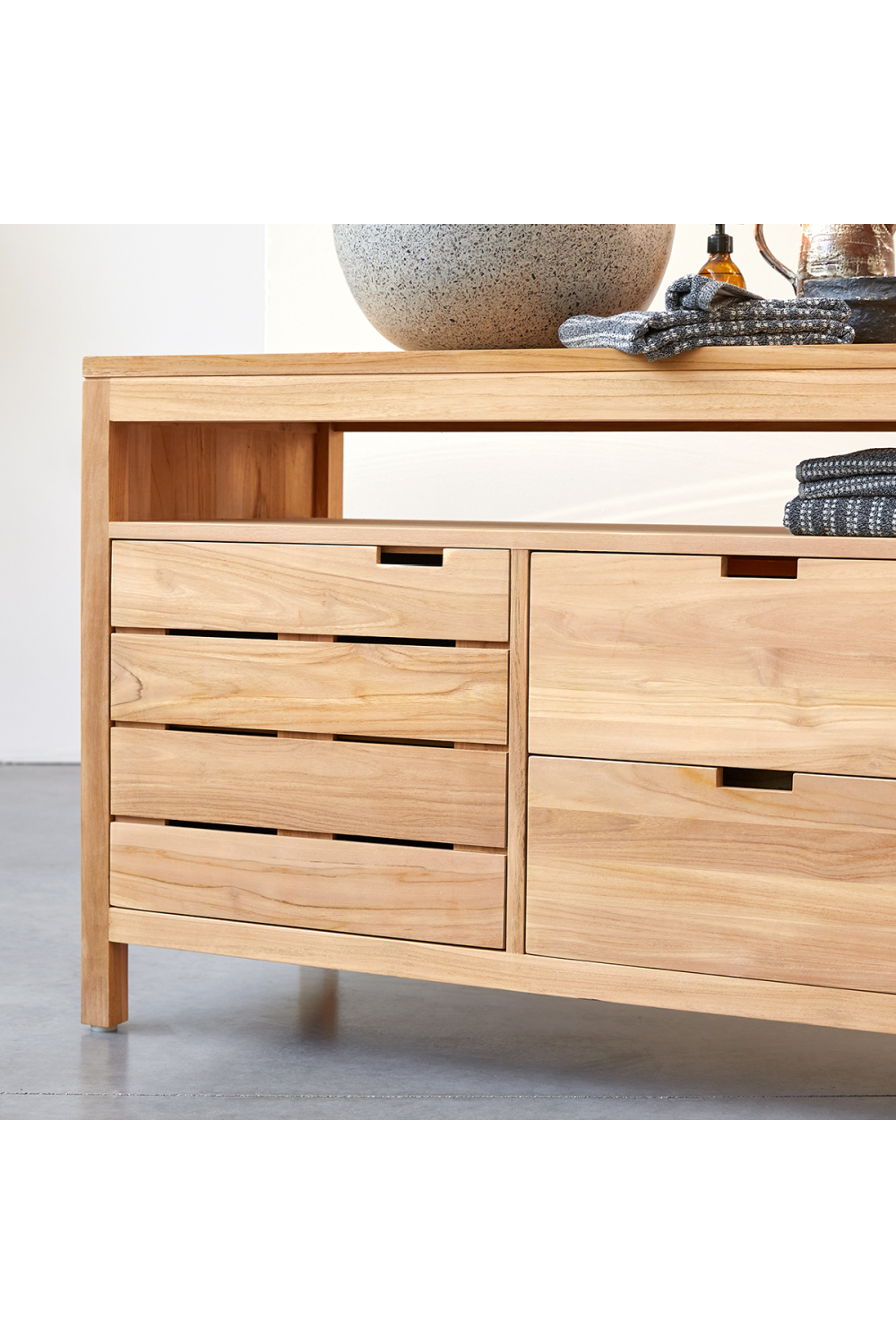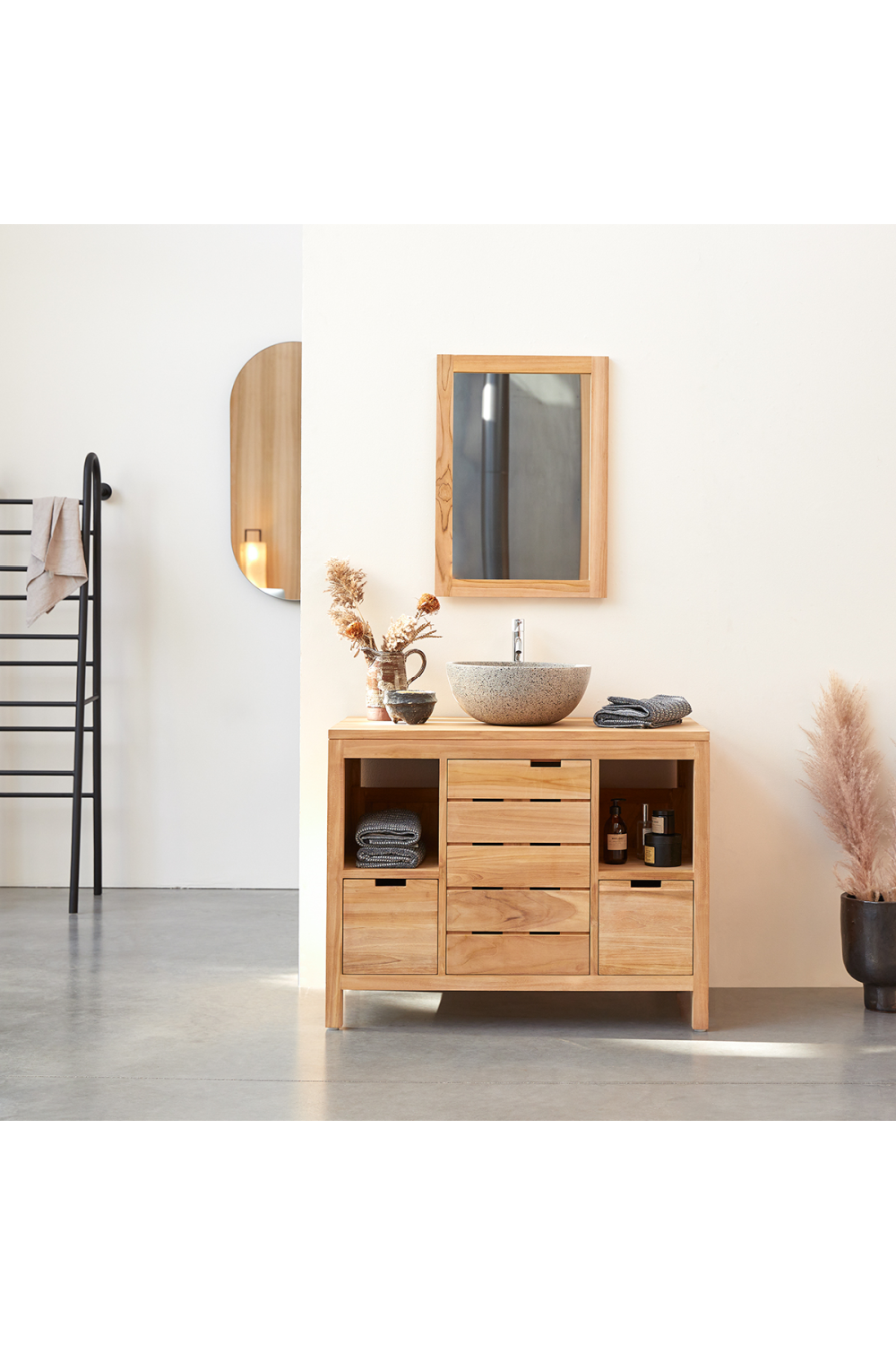 Beautiful bathroom furniture in solid teak. Designed to accommodate 1 sink. The beautifully grained natural teak wood brings light and color into your bathroom. The modern design and large storage capacity make this a convenient and stylish space saver. Discover our range of marble and terrazzo countertops.