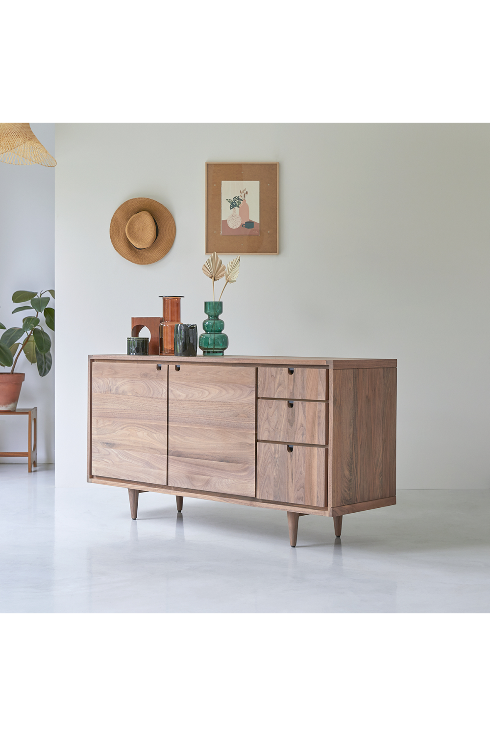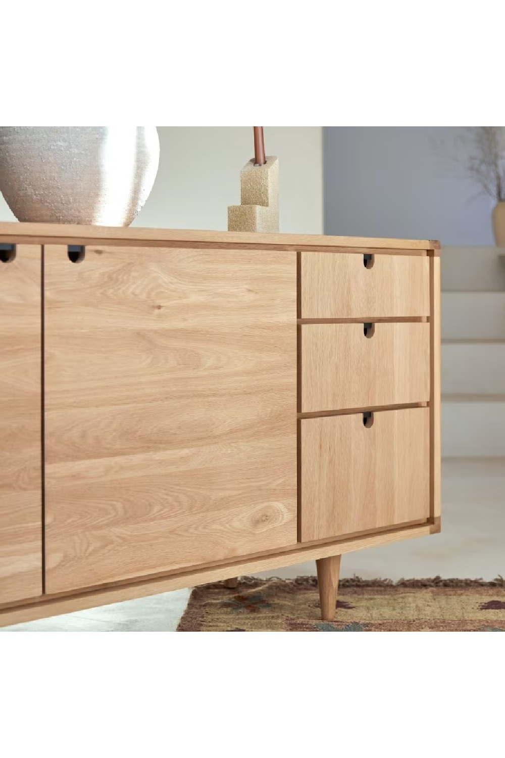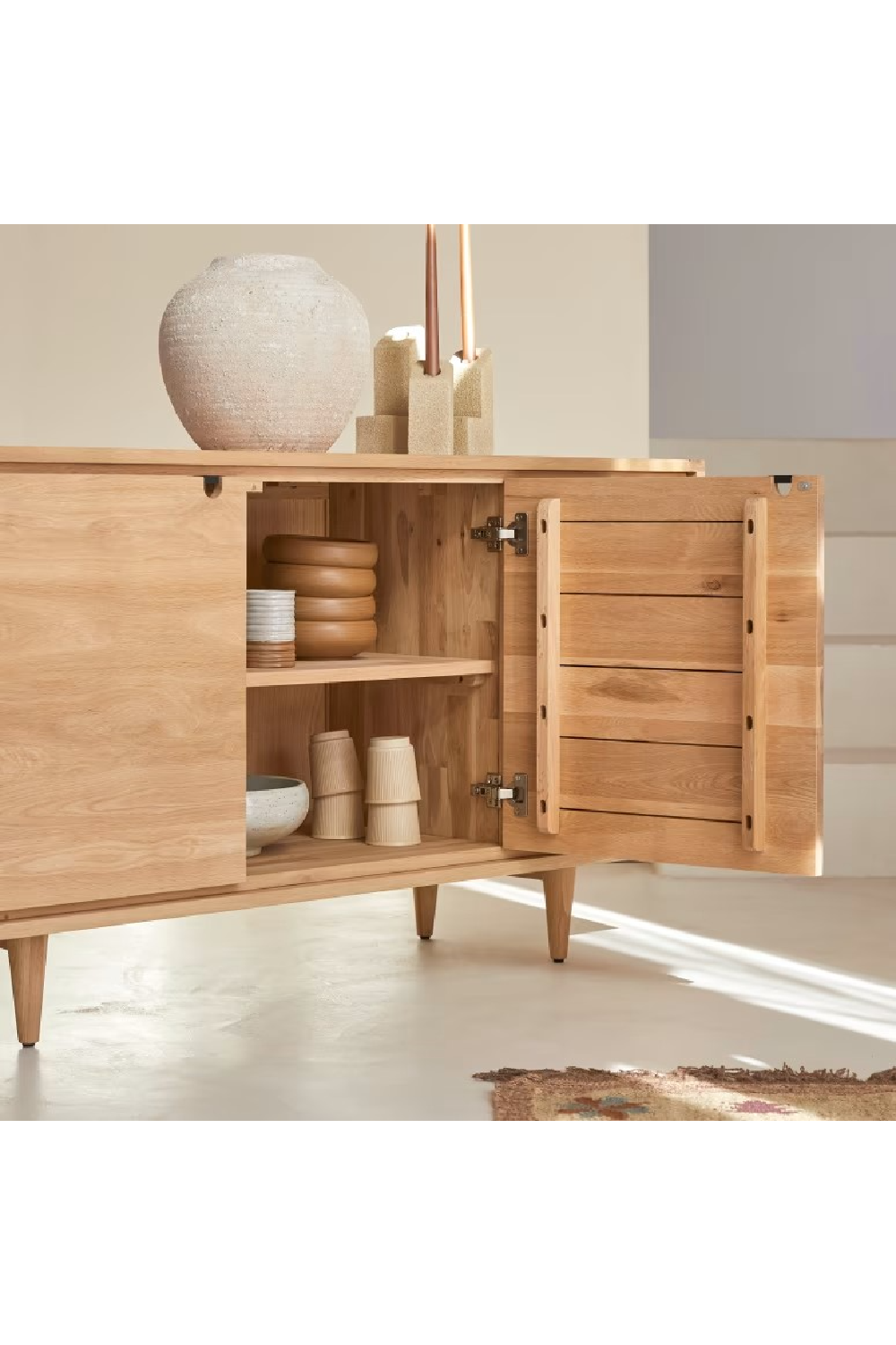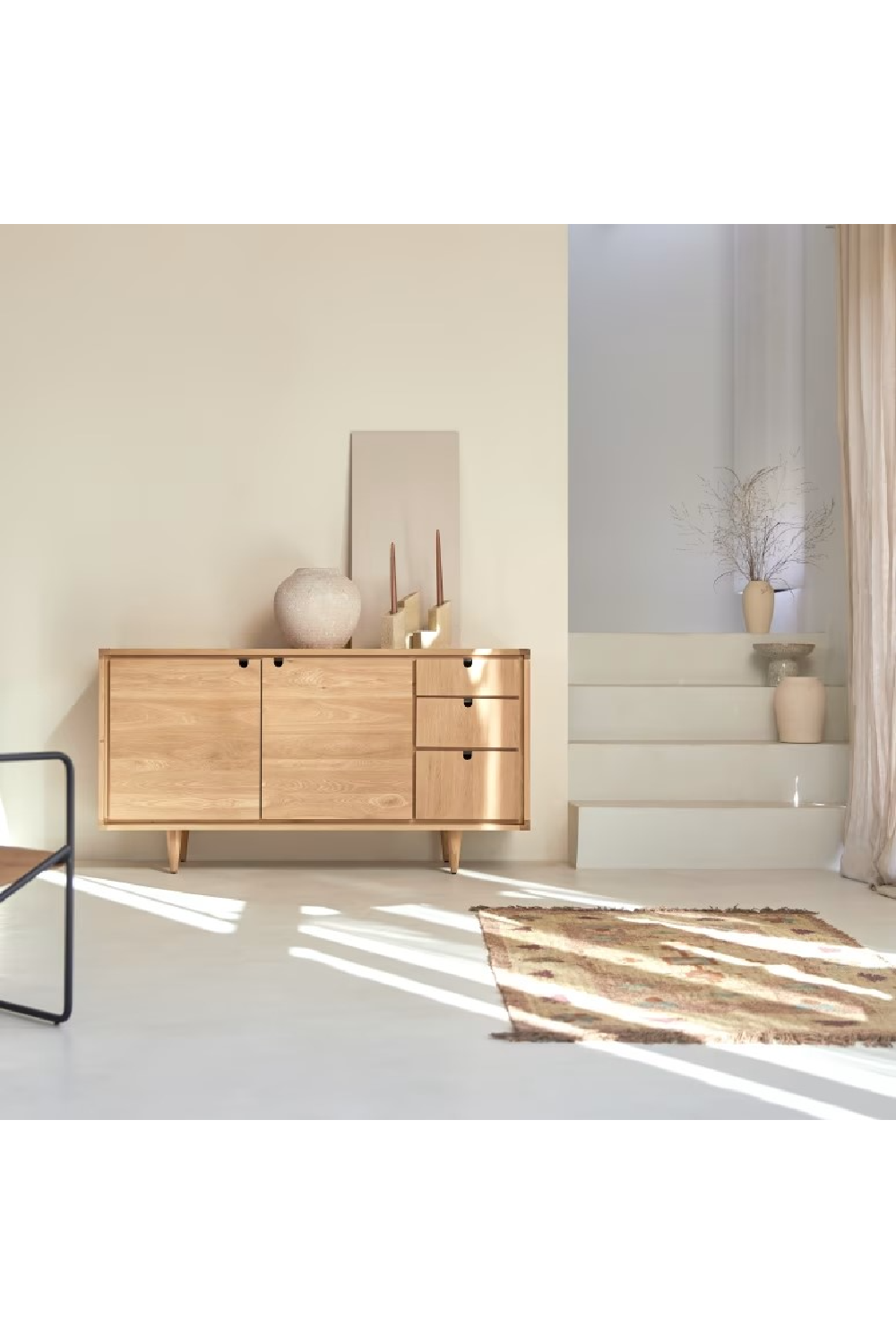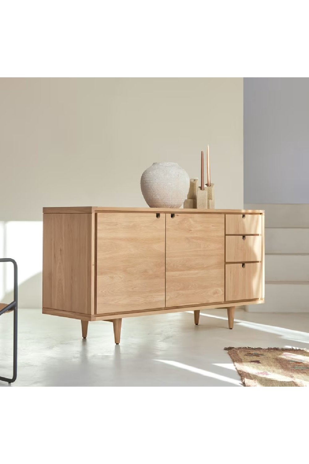 Clean-lined, authentic and functional, the Jonàk Oak sideboard has a Scandinavian style that’s much in vogue in modern interiors! We love its pale solid wood, generous storage capacity, and simple design. Its two hinged doors open onto a large storage space that will give you plenty of room to store household linen or tableware, while smaller, less bulky items can be placed in the drawers. The Jonàk Oak sideboard is part of our innovative Nordic-inspired Scandinavian collection – natural, elegant, and easy to live with day after day – and pairs particularly well with the Jonàk Oak TV unit and coffee table. The Jonàk sideboard is also available in teak. Discover our Jonàk collection in teak!